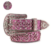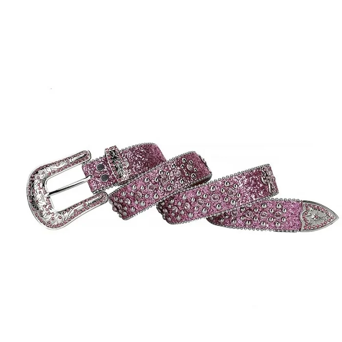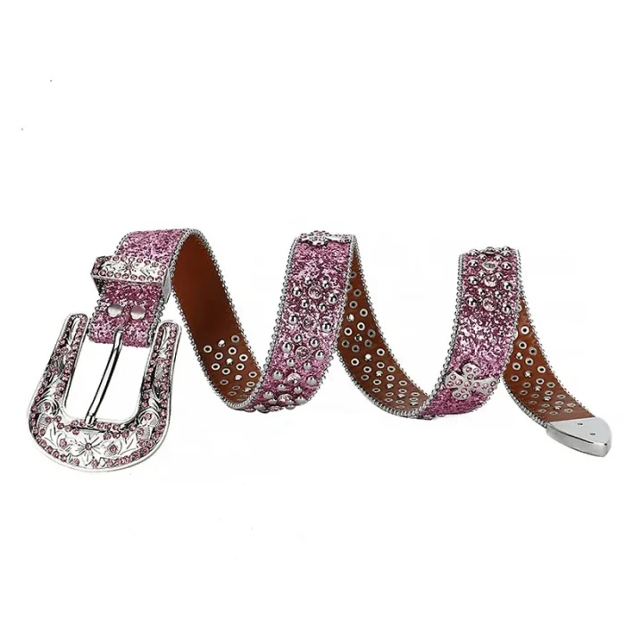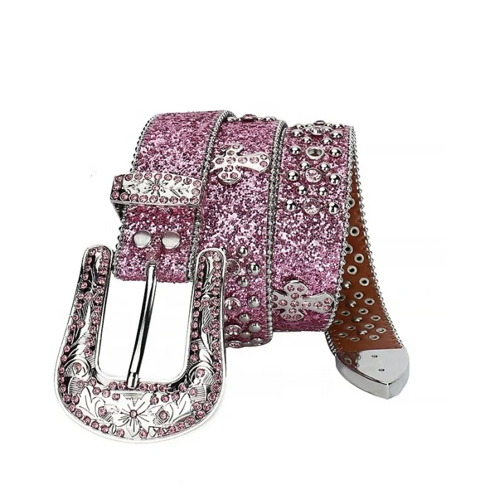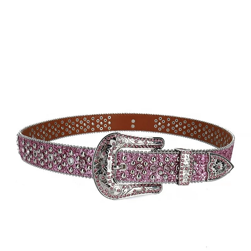 The water diamond belt is made of zinc alloy buckle. A-grade glass diamond. PU material. iron bead chain composition and rivets. purely handmade. directly sold by the manufacturer. and supports customized drawings