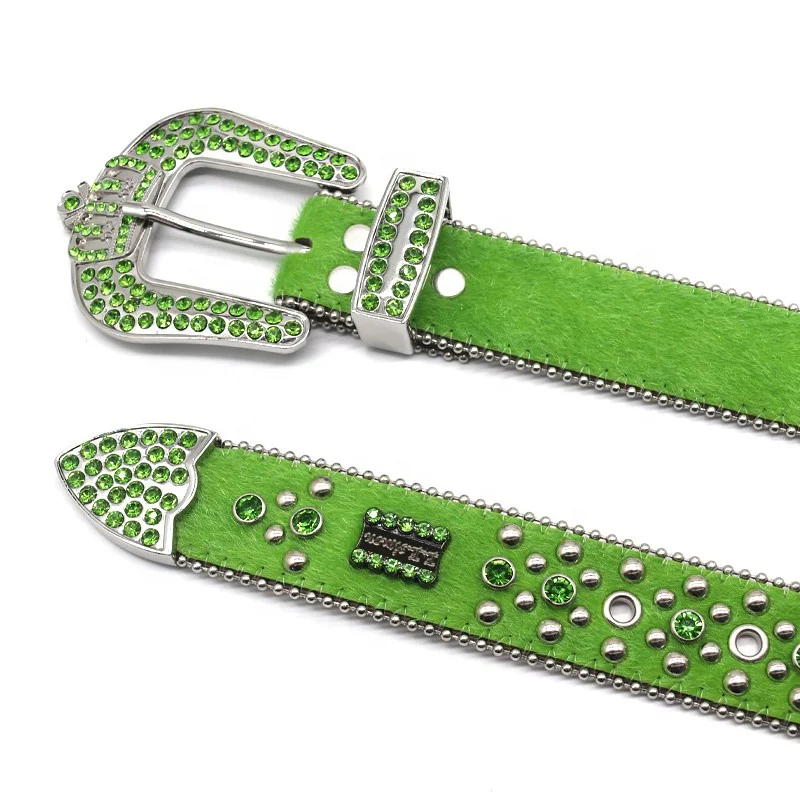 The water diamond belt is made of zinc alloy buckle. A-grade glass diamond. PU material. iron bead chain composition and rivets. purely handmade. directly sold by the manufacturer. and supports customized drawings