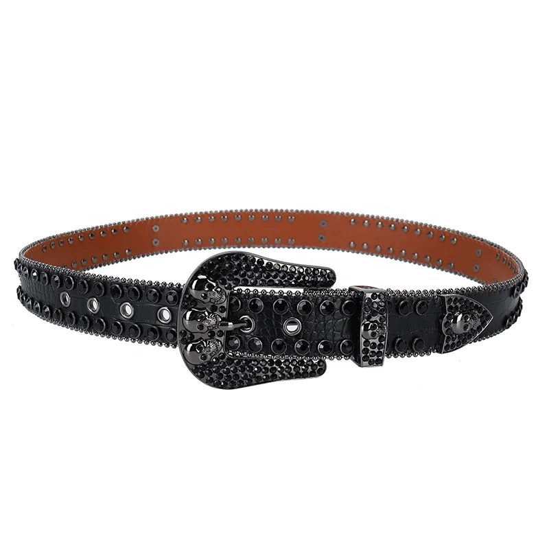The water diamond belt is made of zinc alloy buckle. A-grade glass diamond. PU material. iron bead chain composition and rivets. purely handmade. directly sold by the manufacturer. and supports customized drawings