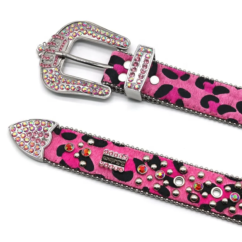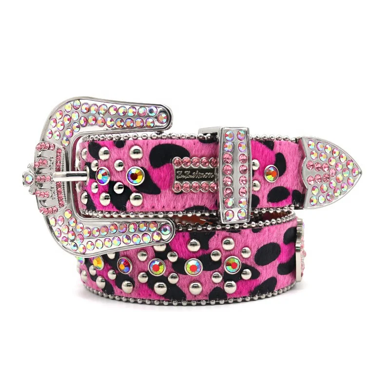 The water diamond belt is made of zinc alloy buckle. A-grade glass diamond. PU material. iron bead chain composition and rivets. purely handmade. directly sold by the manufacturer. and supports customized drawings