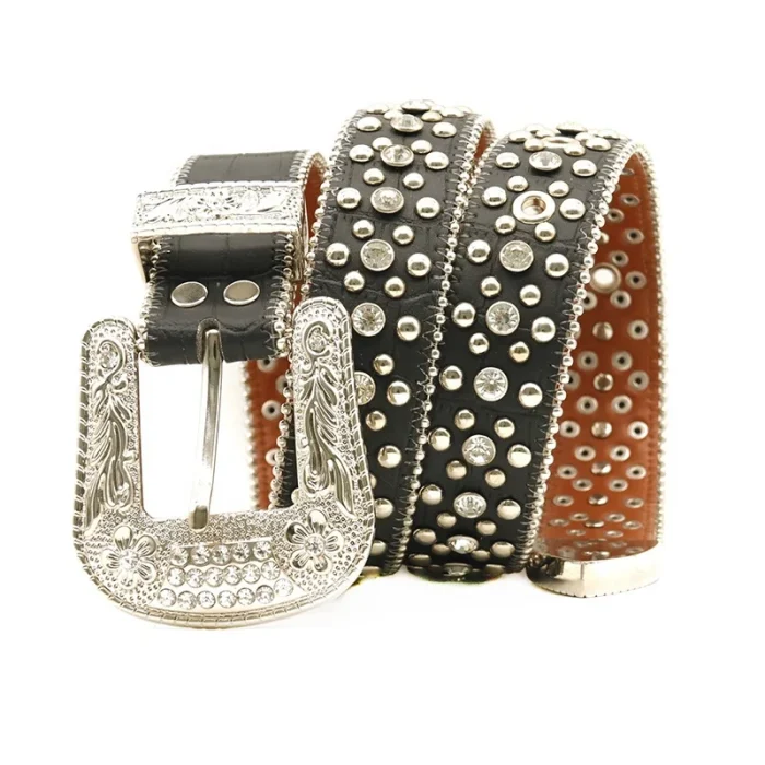 The water diamond belt is made of zinc alloy buckle. A-grade glass diamond. PU material. iron bead chain composition and rivets. purely handmade. directly sold by the manufacturer. and supports customized drawings
