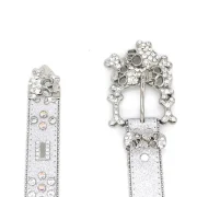 The water diamond belt is made of zinc alloy buckle. A-grade glass diamond. PU material. iron bead chain composition and rivets. purely handmade. directly sold by the manufacturer. and supports customized drawings