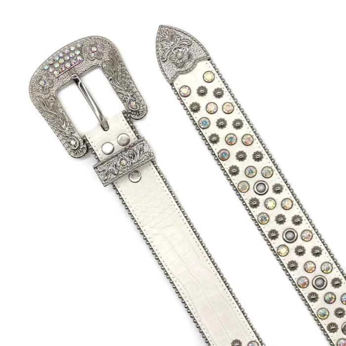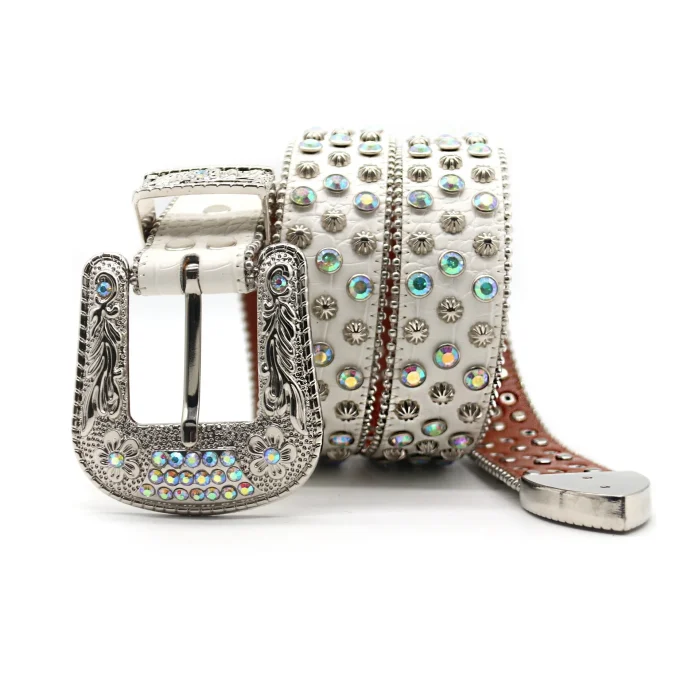 The water diamond belt is made of zinc alloy buckle. A-grade glass diamond. PU material. iron bead chain composition and rivets. purely handmade. directly sold by the manufacturer. and supports customized drawings