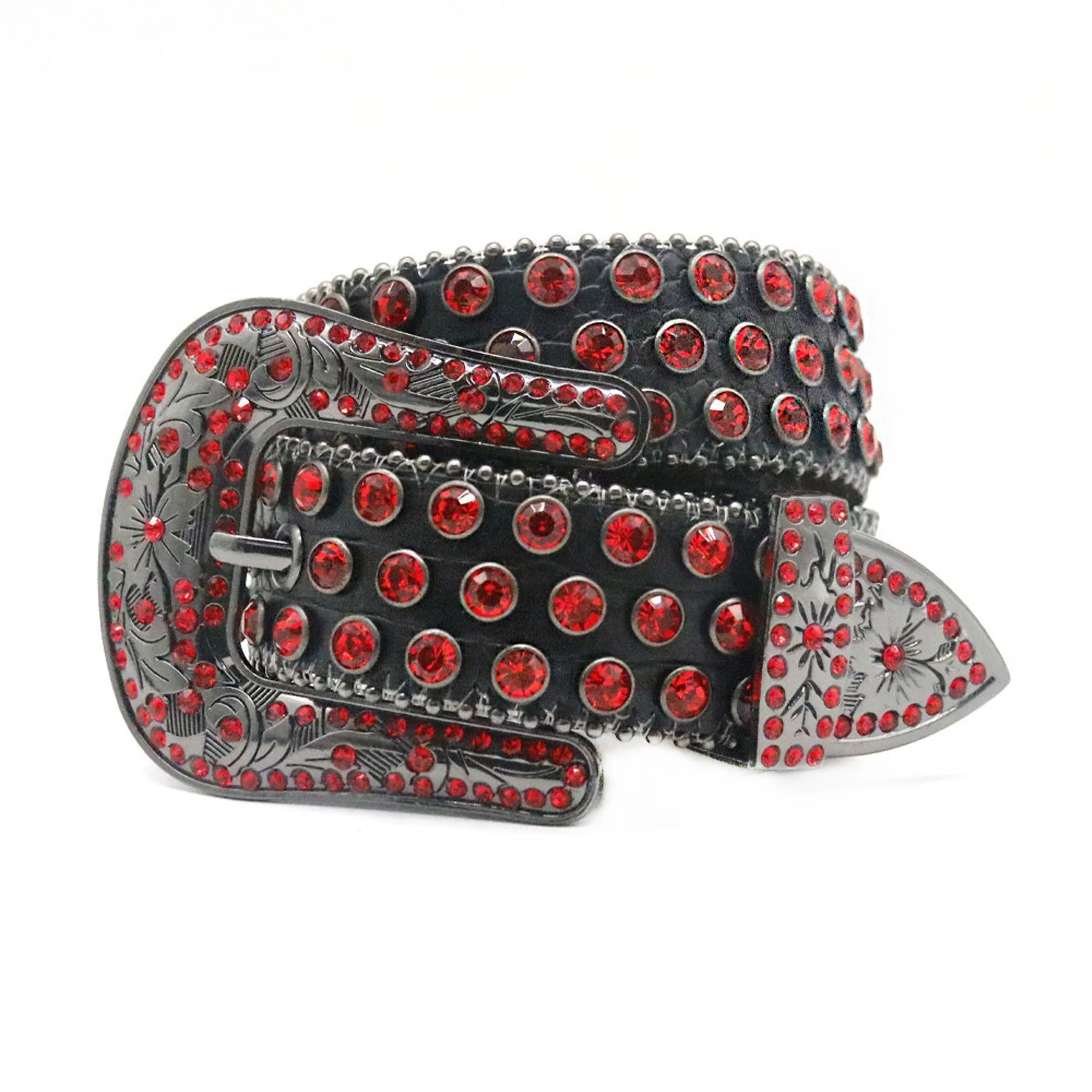 The water diamond belt is made of zinc alloy buckle. A-grade glass diamond. PU material. iron bead chain composition and rivets. purely handmade. directly sold by the manufacturer. and supports customized drawings