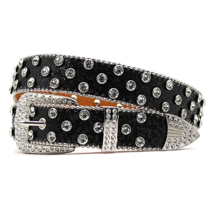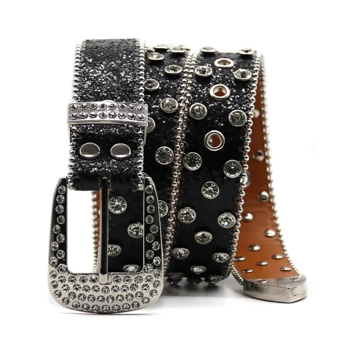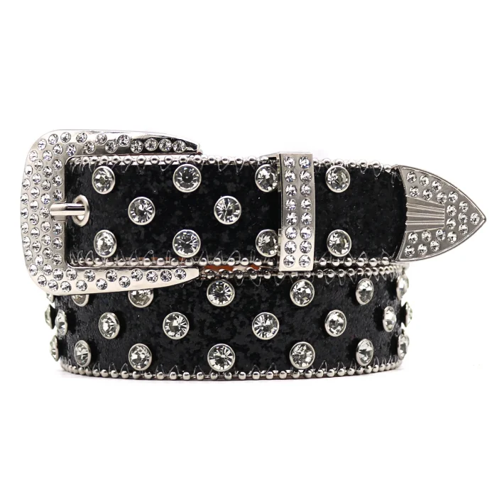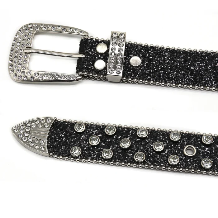 The water diamond belt is made of zinc alloy buckle. A-grade glass diamond. PU material. iron bead chain composition and rivets. purely handmade. directly sold by the manufacturer. and supports customized drawings