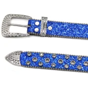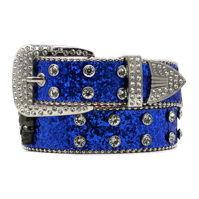 The water diamond belt is made of zinc alloy buckle. A-grade glass diamond. PU material. iron bead chain composition and rivets. purely handmade. directly sold by the manufacturer. and supports customized drawings