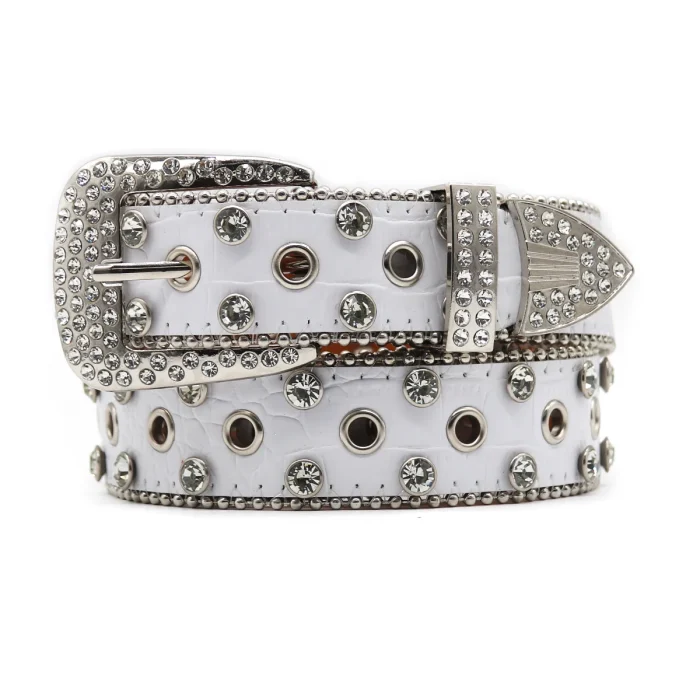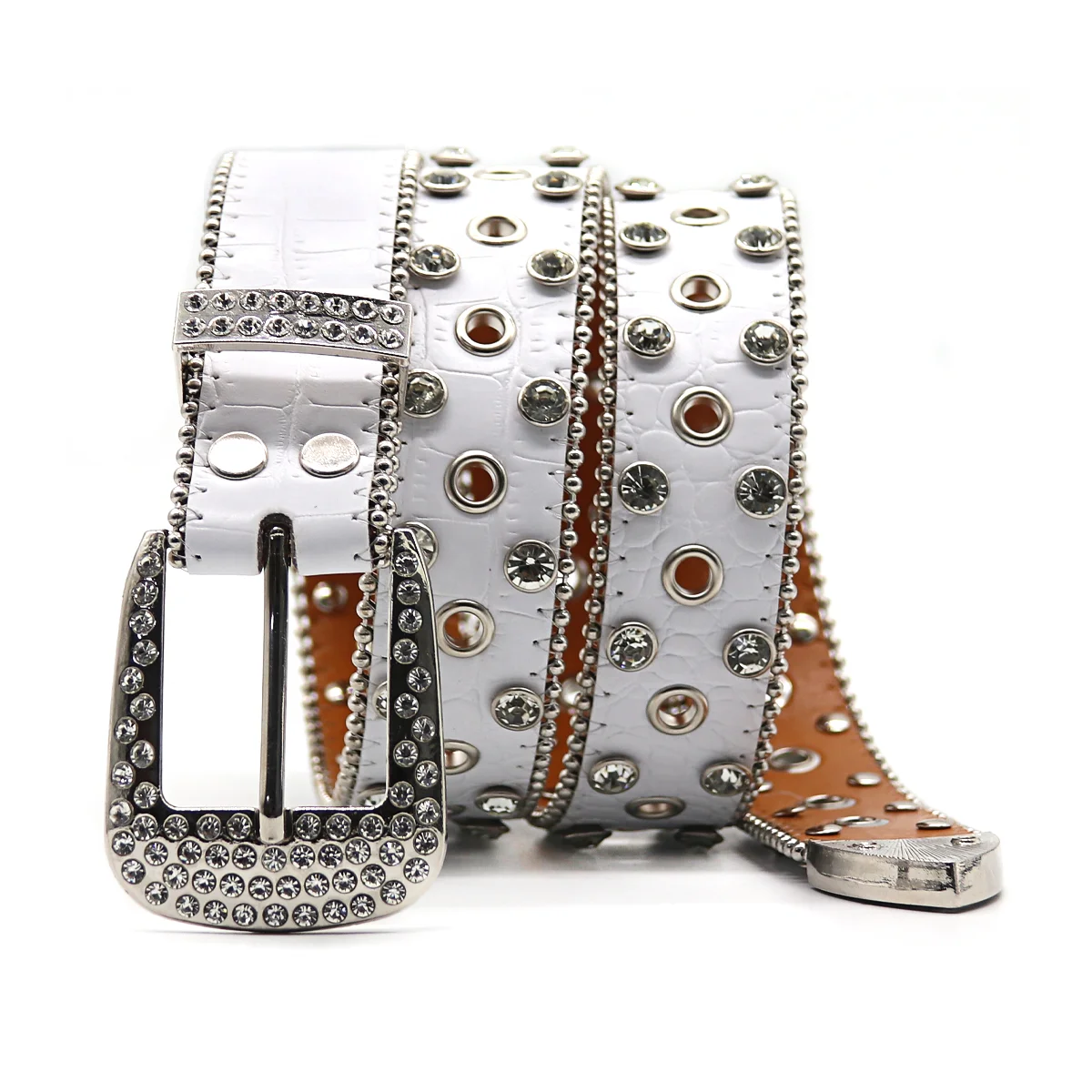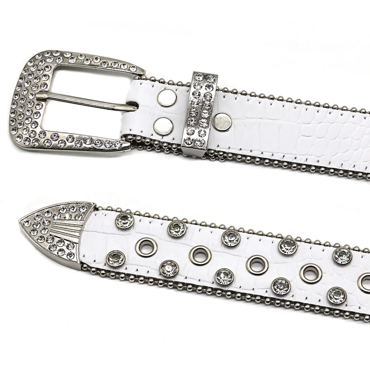 The water diamond belt is made of zinc alloy buckle. A-grade glass diamond. PU material. iron bead chain composition and rivets. purely handmade. directly sold by the manufacturer. and supports customized drawings