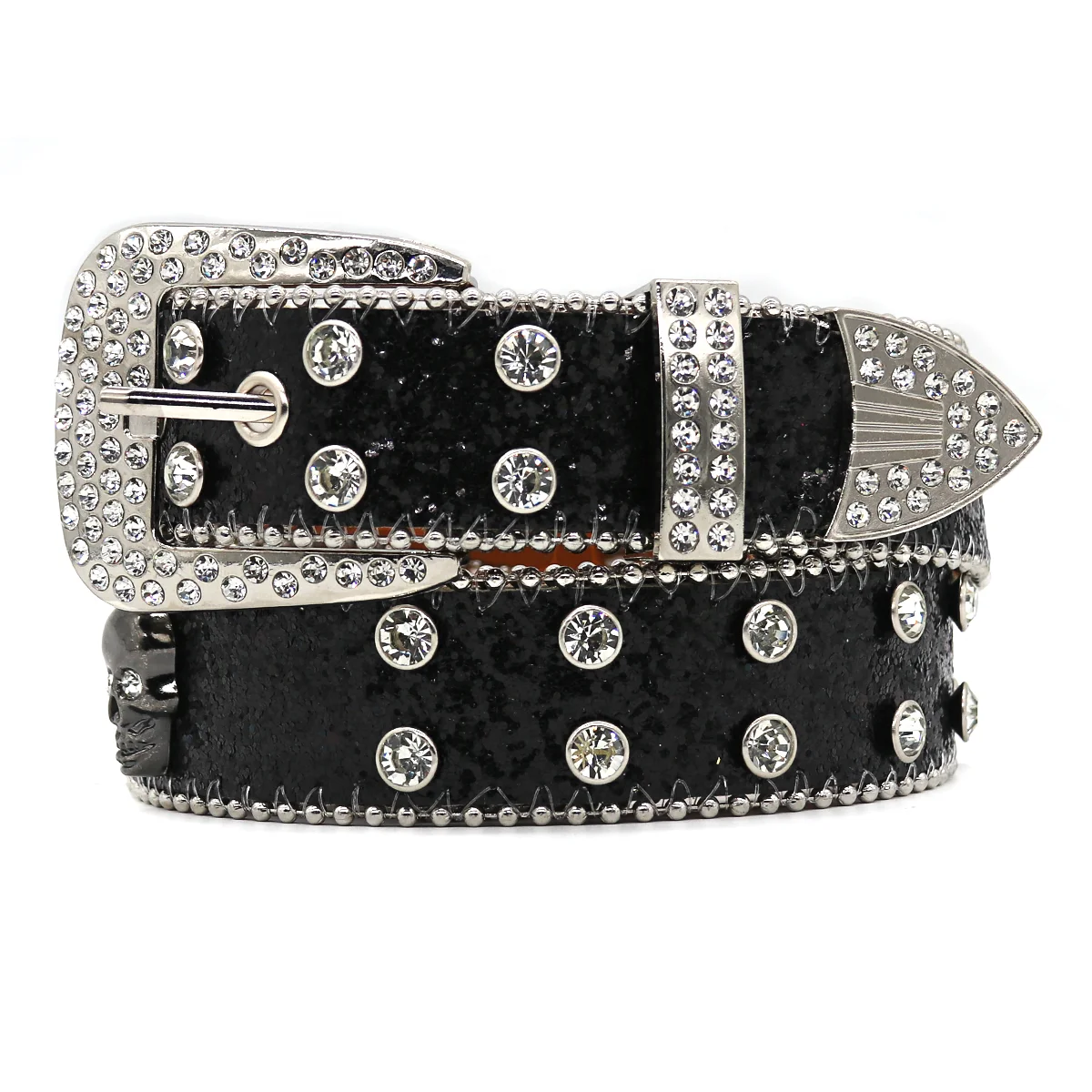 New Western Luxury Fashion Designer Men’s Belt Gold Sparkling Crystal Rhinestone Belt Zinc Alloy Skull Button Custom Belt